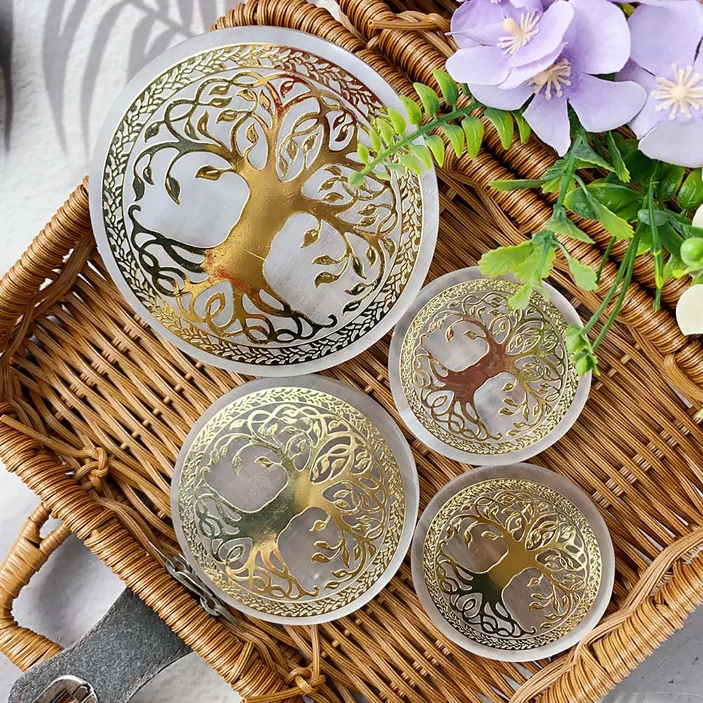 Elevate your spiritual practice with this 6-10cm Natural Selenite Charging Plate. Featuring a Tree of Life design, this white gypsum slice is perfect for energy cleansing, meditation, and chakra balancing. Ideal for Feng Shui decor, selenite is known for its calming and healing properties. Use this elegant charging plate to enhance your meditation sessions and spiritual rituals, bringing harmony and positive energy into your space.   Product Name Selenite Slice Craft: Printing, Bronzing Pattern: Tree of life Size 6CM/8CM/10CM Weight 6CM Approx 50g 8CM Approx 110g 10CM Approx 240g
