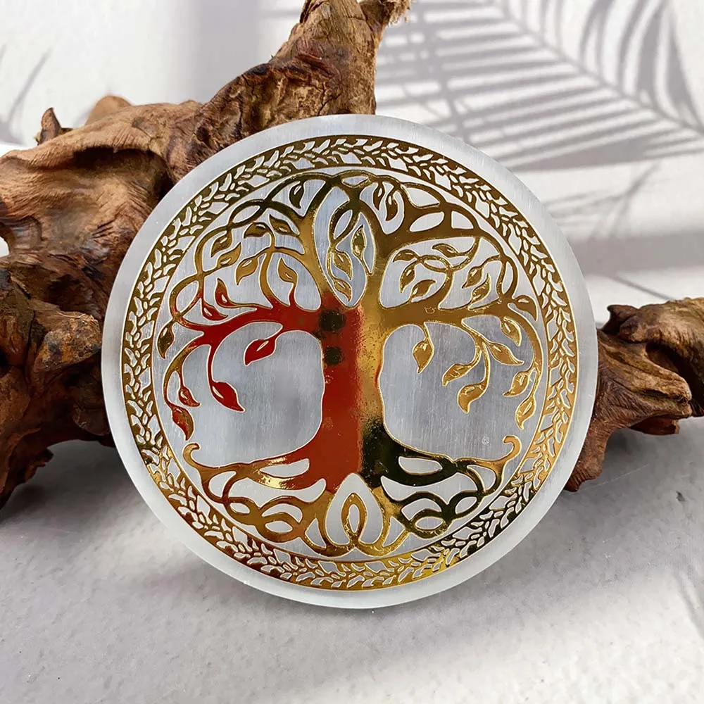 Elevate your spiritual practice with this 6-10cm Natural Selenite Charging Plate. Featuring a Tree of Life design, this white gypsum slice is perfect for energy cleansing, meditation, and chakra balancing. Ideal for Feng Shui decor, selenite is known for its calming and healing properties. Use this elegant charging plate to enhance your meditation sessions and spiritual rituals, bringing harmony and positive energy into your space.   Product Name Selenite Slice Craft: Printing, Bronzing Pattern: Tree of life Size 6CM/8CM/10CM Weight 6CM Approx 50g 8CM Approx 110g 10CM Approx 240g